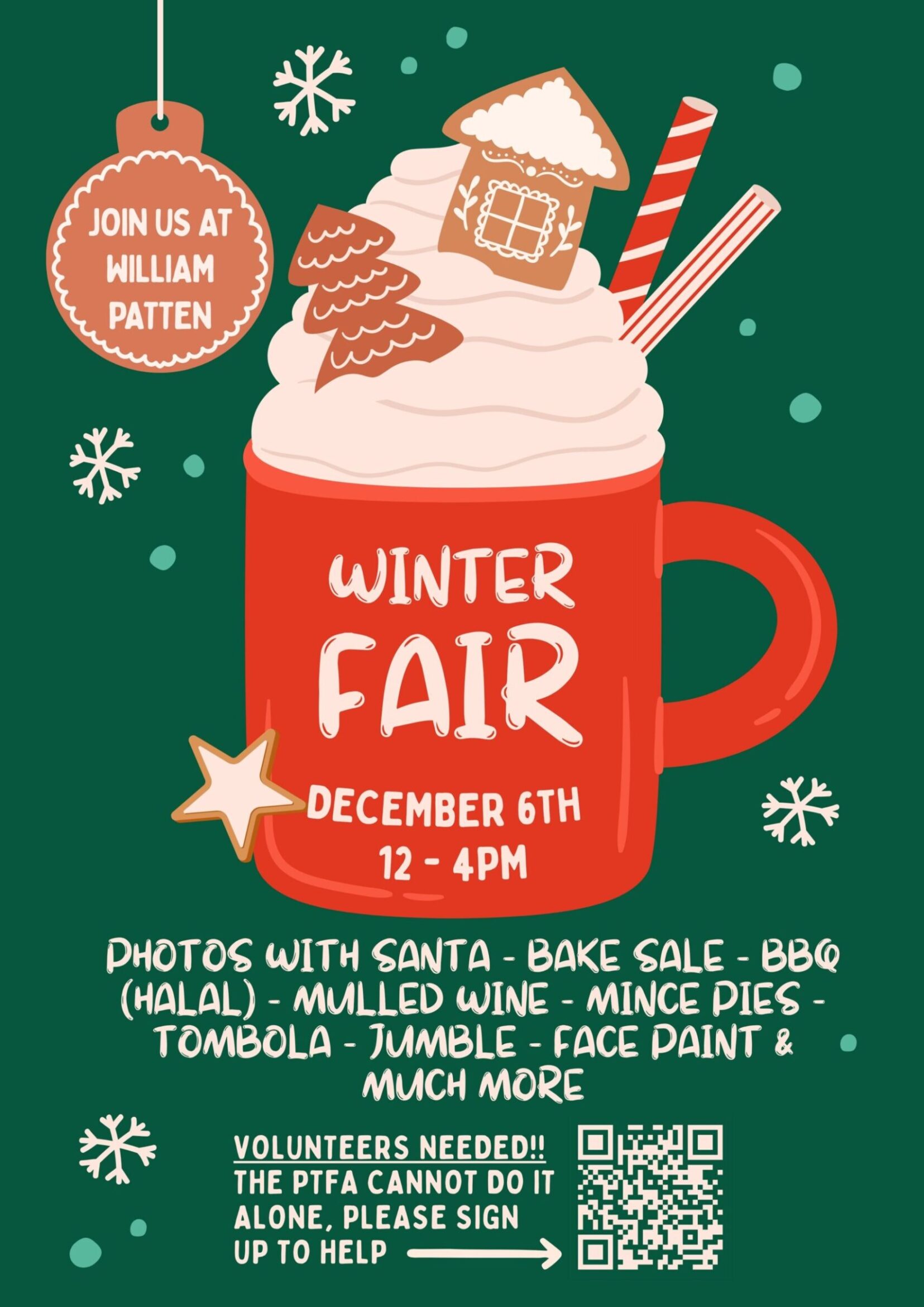 It is the time of year again for William Patten’s Winter Fair! The fair is always very fun and it’s a wonderful way to raise funds for the school and celebrate the festive season. This year we are planning some delicious food, mulled wine and mince pies, festive games and of course a chance for the children to meet and have their photo taken with Father Christmas.